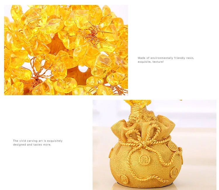 Made of resin and crytal stone,Leaves and branches can be arranged how you like Crystal energy is strong, commonly known as the stone of wealth, crystal can affect material life and financial luck Money Tree -Legendary treasure tree ,its branch money is renewable, besides having the town house, can strengthen the magnetic field ,let you blessing gas, the finance, the popularity is abundant, full of life vitality.